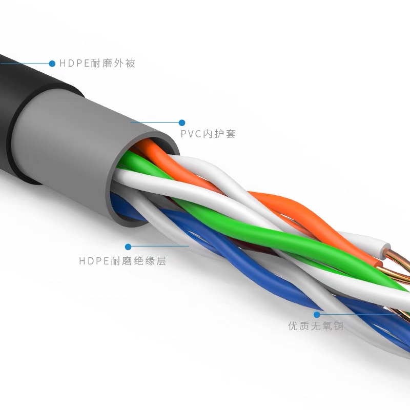 室外网线是用于室外的线,于室外架空和管道使用,可以防止潮气侵入。室外网线不仅可以在室外布线,还可以在室内布线,在一些室内湿度较大地方,也可以用。为了使双绞线在移动中不至于断线,除外皮保护层外,外部的PE还要具有一定的韧性。