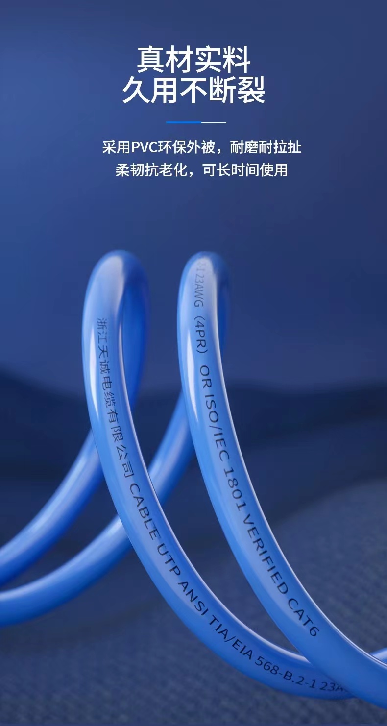 采用规格23AWG的单芯裸铜为导体,聚乙烯类高分子材料为绝缘体,外皮材料采用阻燃型高分子材料,颜色为蓝/绿;双绞线符合国际规范(ISO/IEC)的要求,电气特性超过六类(Cat.6)国际规范的要求,电缆中心十字架隔离保证NEXT性能和合理施工弯曲半径。
