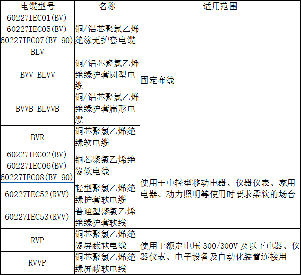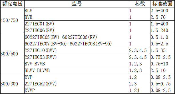 本产品适用于交流额定电压450/750V及以下的家用电器,小型电动工具、仪器仪表及动力照明装置电源连接,其型号、名称及使用范围见表1。电线的工作温度除BV-90、RV-90为90℃外,其余均为70℃。